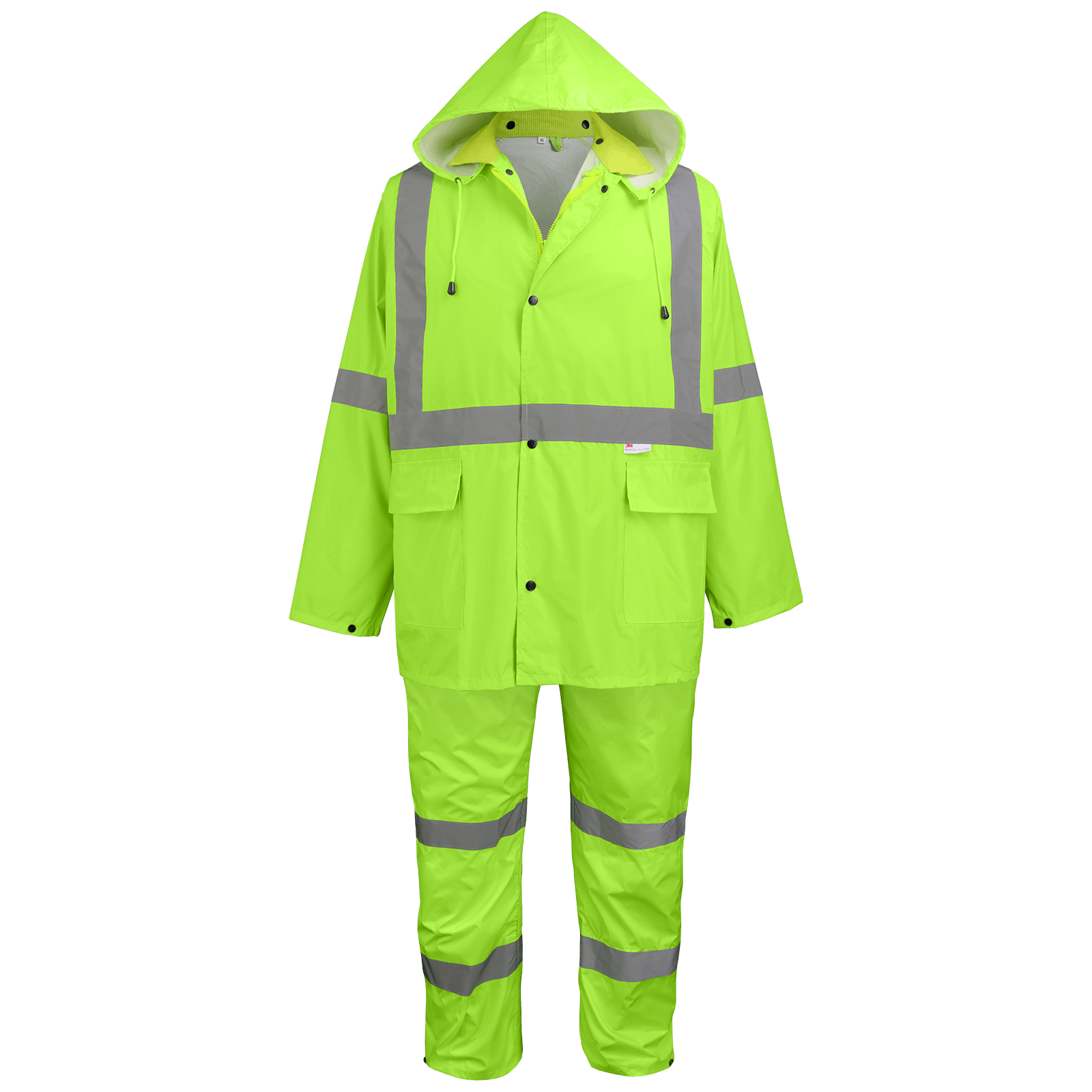 This three-piece yellow/green PVC/polyester rain suit includes bibs, a detachable hood, and a jacket. The rain suit features 3M reflective material for low-light visibility. Jacket has a vented back, two front pockets, and an adjustable snap waist and sleeve ends. The zipper and snap closure on the jacket have a storm flap. The detachable hood comes with a drawstring for easy adjustment. Rain bibs feature an adjustable snap waist and ankles and a reinforced triangle crotch for added durability (sizes M-5XL only).