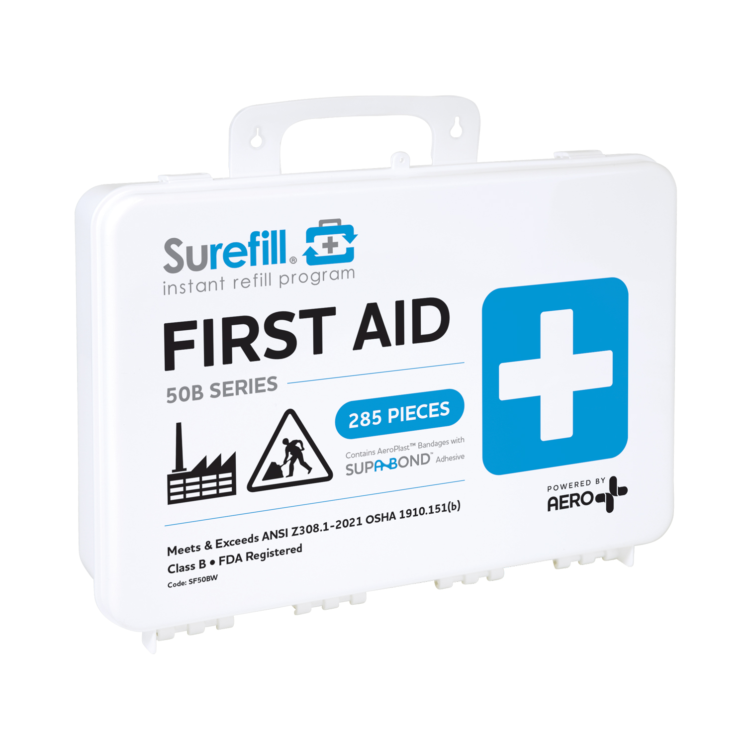 El botiquín de primeros auxilios Surefill Serie 50B, resistente a la intemperie, está diseñado para entornos laborales de tamaño mediano e incluye productos de primeros auxilios de calidad necesarios para tratar a los trabajadores lesionados y facilitar su reincorporación al trabajo. Su estuche resistente protege el contenido del polvo y los daños propios del uso diario.